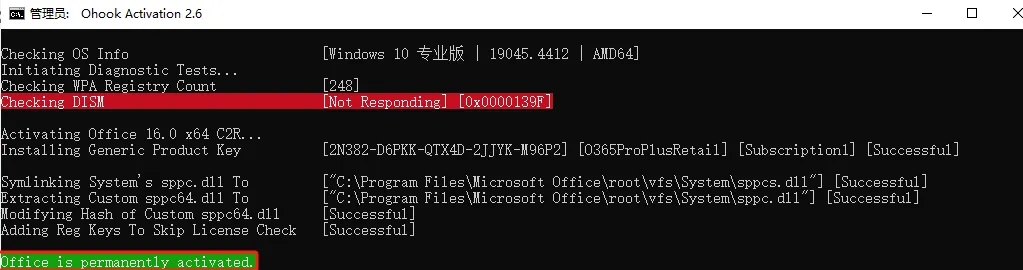 输入数字:1,显示如下图,出现『Office is permanently activated』说明成功。