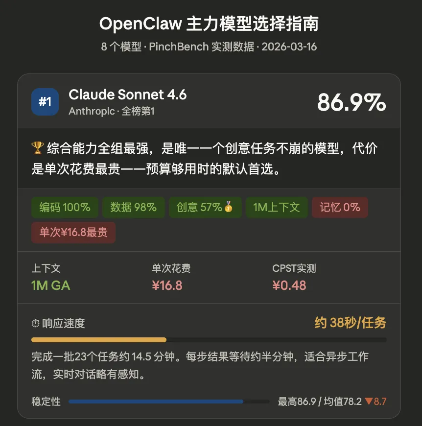 但它有一个其他模型没有的优势:创意任务得了 57%。听起来不高,但其他模型大多是 0%。这不是模型本身不会创意,而是 OpenClaw 的沙箱环境里,图片生成工具有时候用不上。Sonnet 4.6 在这类任务里的表现是例外。