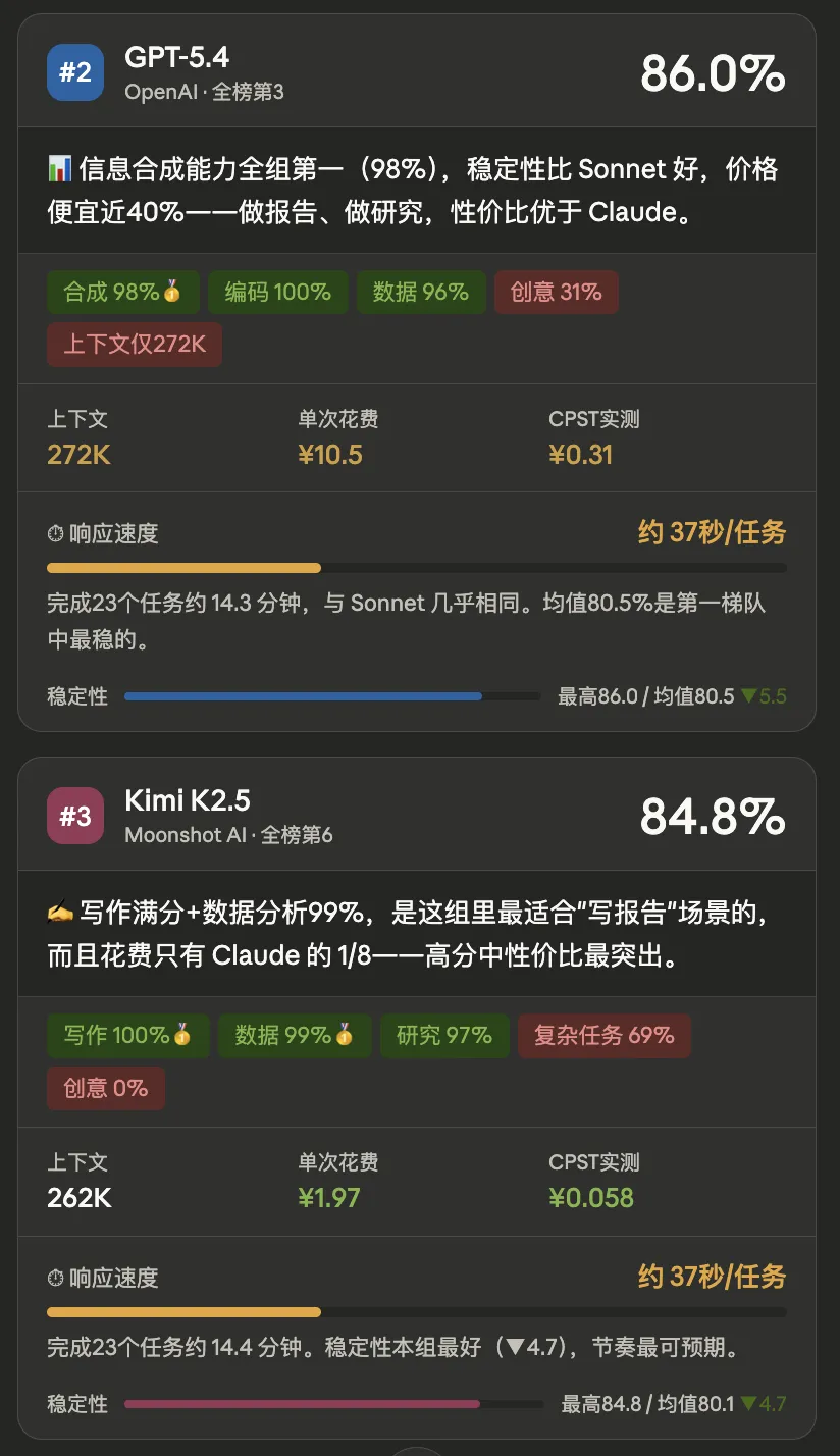 Kimi K2.5 的写作是满分,数据分析是 99%。 在这组里,没有第二个模型同时在这两件事上表现这么好。而且它的单次花费只有 ¥1.97,稳定性也是全组最好之一。如果你主要用 OpenClaw 来写报告、整理研究、分析数据,它大概是最省心的选择。