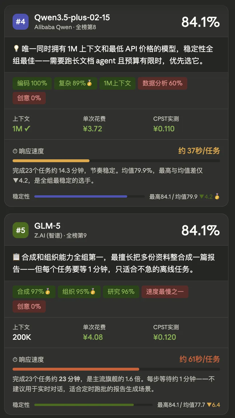 GLM-5 最擅长整合与归纳,但不要在实时场景里用它。 合成 97%,内容组织 95%,这两项是全组最高。但它每个任务要等 61 秒,完成 23 个任务要 23 分钟。这是一个适合离线批量任务的模型,不是一个适合坐在屏幕前等待结果的模型。