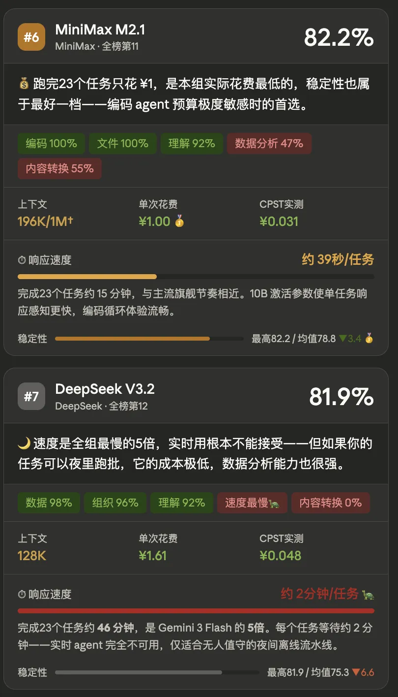 DeepSeek V3.2 的问题只有一个:慢。 不是有点慢,是很慢。每个任务平均要等 2 分钟。完成 23 个任务需要 46 分钟——是同组最快的 Gemini 3 Flash 的整整 5 倍。这不是可以接受的等待,这是折磨。但如果你的任务不需要实时响应,只需要夜里跑完、早上看结果,它的成本和数据分析能力(98%)是很有竞争力的。