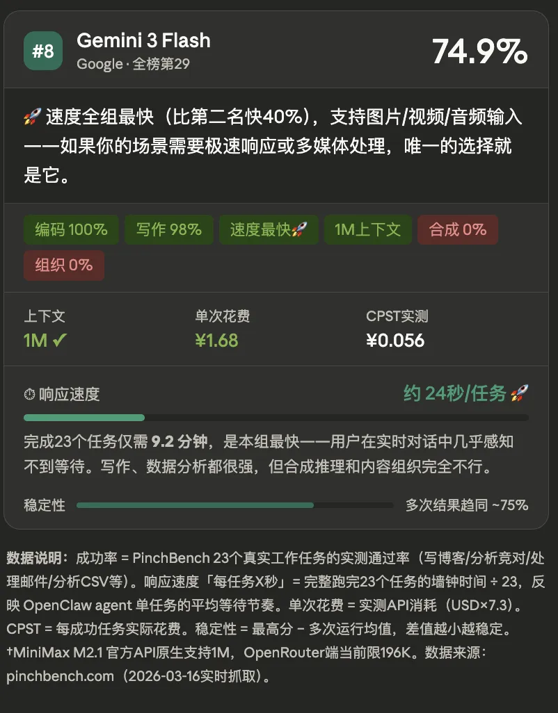 所以当我们说"Gemini 3 Flash 每个任务平均 24 秒",意思是:你把任务交给它,24 秒后你能看到结果。