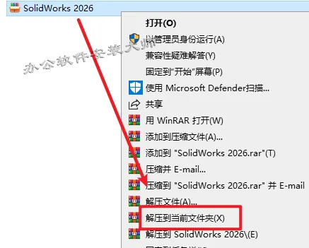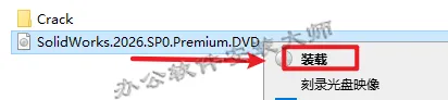 12.回到刚才解压好的文件夹,选中【SolidWorks.2026.SP0.Premium.DVD】文件,鼠标右键选择【装载】(如没有【装载】这个选项,可以右键选择【打开方式—Windows资源管理器】打开即可)