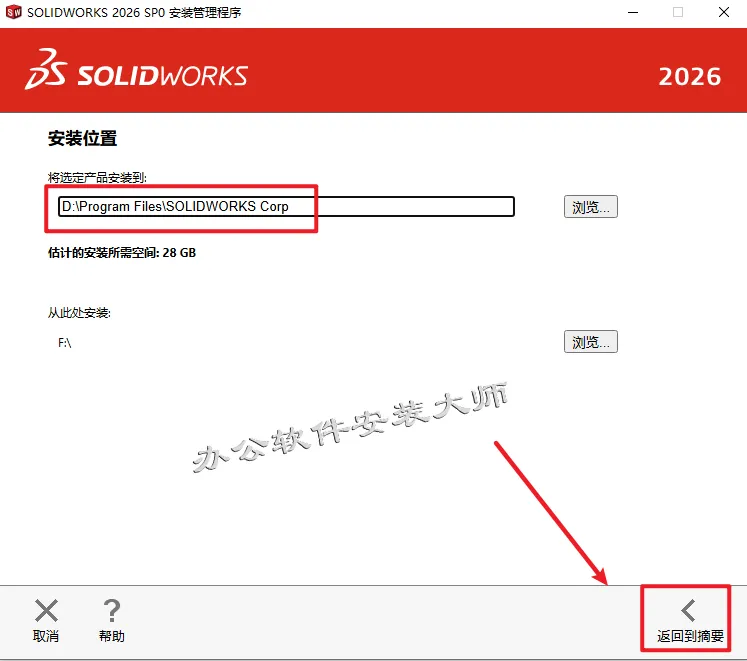 19.自定义选择好程序安装位置,点击【返回到摘要】。(注意:安装路径不要有中文)