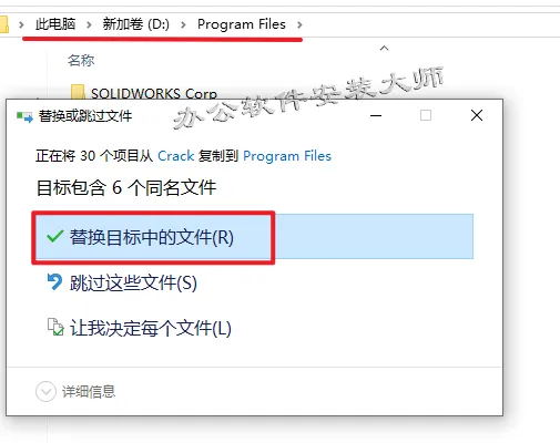27.依次打开步骤19自己选择的软件安装位置,我这里前面选择安装位置是:D:\Program Files\SOLIDWORKS Corp,打开后【粘贴】前面复制的文件夹到该路径下,弹窗点击【替换目标中的文件】。
