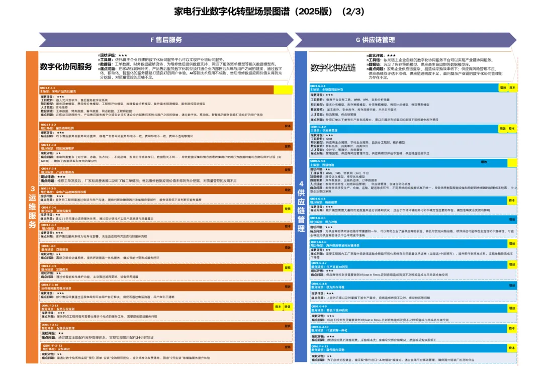 “数字化协同服务” 成为转型新亮点。新能源汽车行业推进动力电池远程运维与车联网安全管控,但商业模式仍处于探索阶段;医疗装备行业构建远程监测与预测性维护体系,却受限于设备通信协议不统一;家电行业打通售后工单与备件管理数据,但 AI 技术在故障诊断中的应用不成熟;机器人行业依托云平台实现远程运维,却面临故障响应慢、技术门槛高的痛点。核心瓶颈在于服务数据与生产数据割裂,智能化服务模型训练不足。