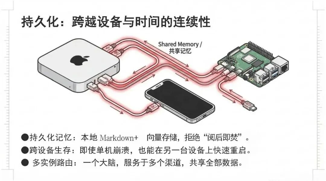 传统AI对话像沙滩上的字,潮水一来便消失。OpenClaw采用本地Markdown + 向量存储(SQLite/LanceDB),实现跨设备的记忆连续性。即使单机崩溃,也能在另一台设备上快速重启——这不仅是技术实现,更是对"数字孪生"理念的践行。