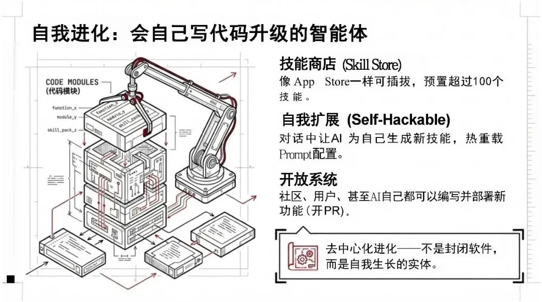 技能商店(Skill Store)像App Store一样可插拔,预置超过100个技能。更 radical 的是Self-Hackable机制——用户可在对话中让AI为自己生成新技能,热重载Prompt配置。社区、用户、甚至AI自己都可以编写并部署新功能。