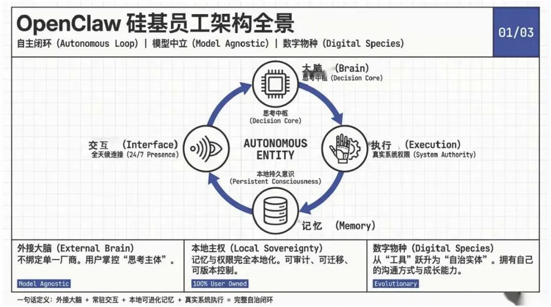 核心洞察:OpenClaw不是聊天机器人,而是驻扎在本地计算环境的"行动原生内核"——它是可编程的个人操作系统(OS)。