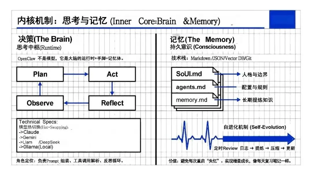 ┌─────────────────────────────────────────┐│ 大脑 (Brain) ││ 思考中枢 (Decision Core) ││ Plan → Act → Reflect → Observe │└──────────────┬──────────────────────────┘ │ 本地持久意识┌──────────────▼──────────────────────────┐│ 记忆 (Memory) ││ SoUI.md / agents.md / memory.md ││ 技术栈:Markdown/JSON/Vector DB/Git │└──────────────┬──────────────────────────┘ │┌──────────────▼──────────────────────────┐│ 交互 (Interface) ││ 全天候连接 (24/7 Presence) ││ Telegram/WhatsApp/Slack/iMessage │└──────────────┬──────────────────────────┘ │┌──────────────▼──────────────────────────┐│ 执行 (Execution) ││ 真实系统权限 (System Authority) ││ Shell/Browser/File I/O/Task │└─────────────────────────────────────────┘三大设计哲学贯穿其中: