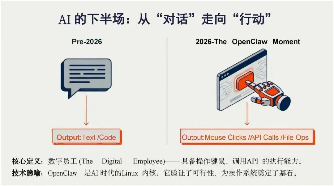 但比数据更值得关注的是范式转移:GPT们定义了AI的"后端"(算力与智能),OpenClaw则补上了缺失的"前端"——将智能转化为行动的执行层。