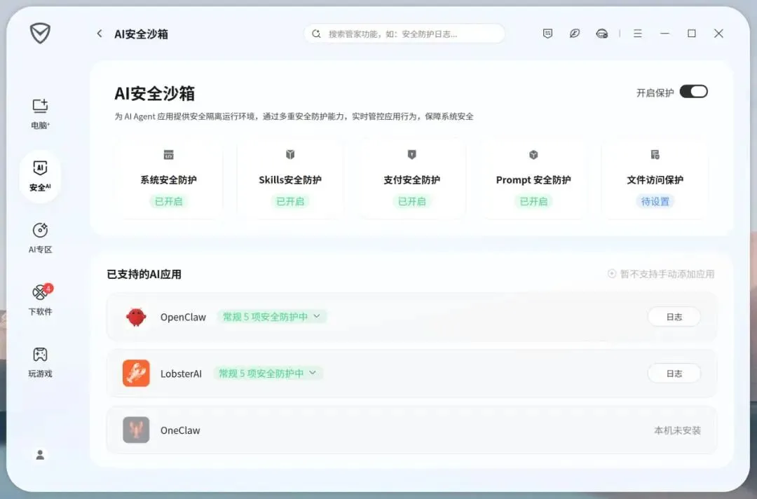 安全沙箱。腾讯电脑管家 18.0 专门推出了 AI 安全沙箱,五重防护,操作日志全程可追溯。