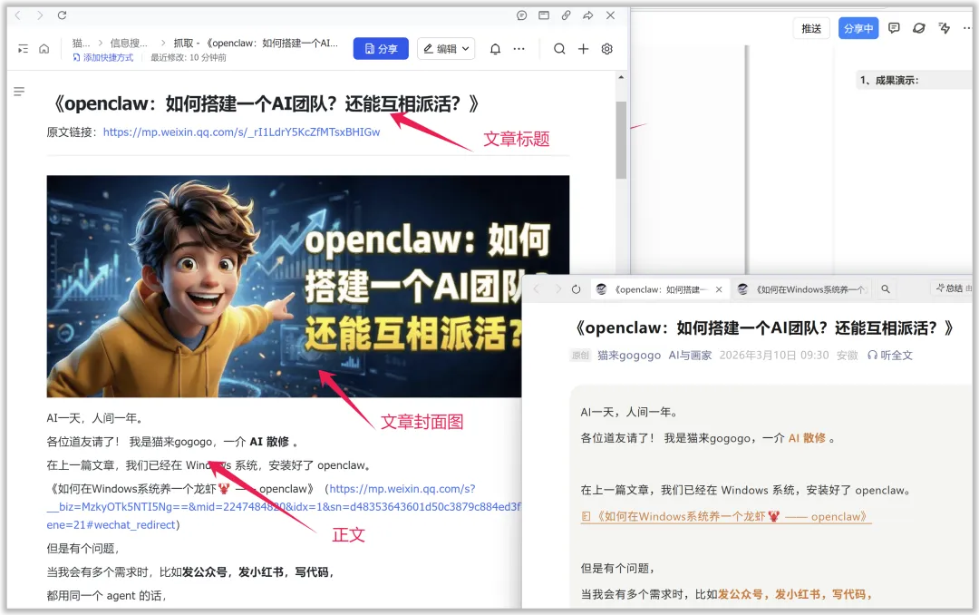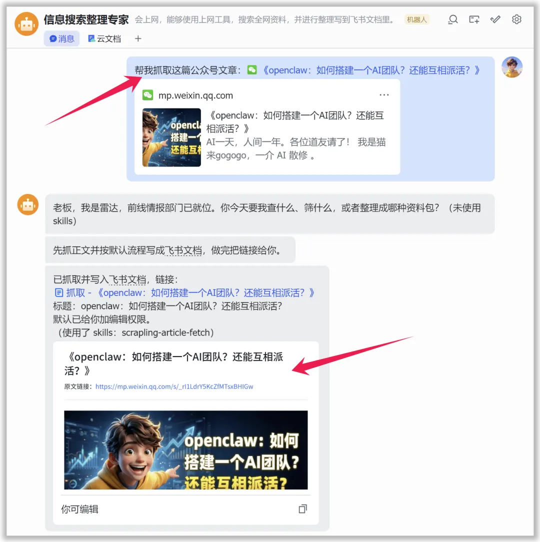 然后在飞书中,把链接发给我的小龙虾,并让它抓取这篇公众号文章: