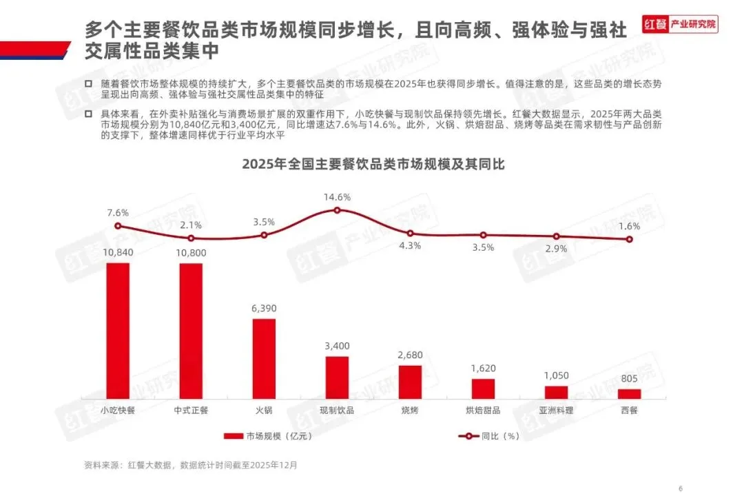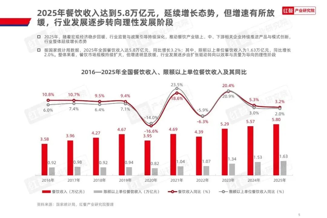 餐饮行业概况:2025年全国餐饮收入达5.8万亿元,同比增长3.2%;其中,限额以上单位餐饮收入为1.63万亿元,同比增长2.0%。整体来看,餐饮市场规模持续扩大,但增速明显放缓,行业发展逐步由扩张驱动转向以效率与质量为导向的理性阶段