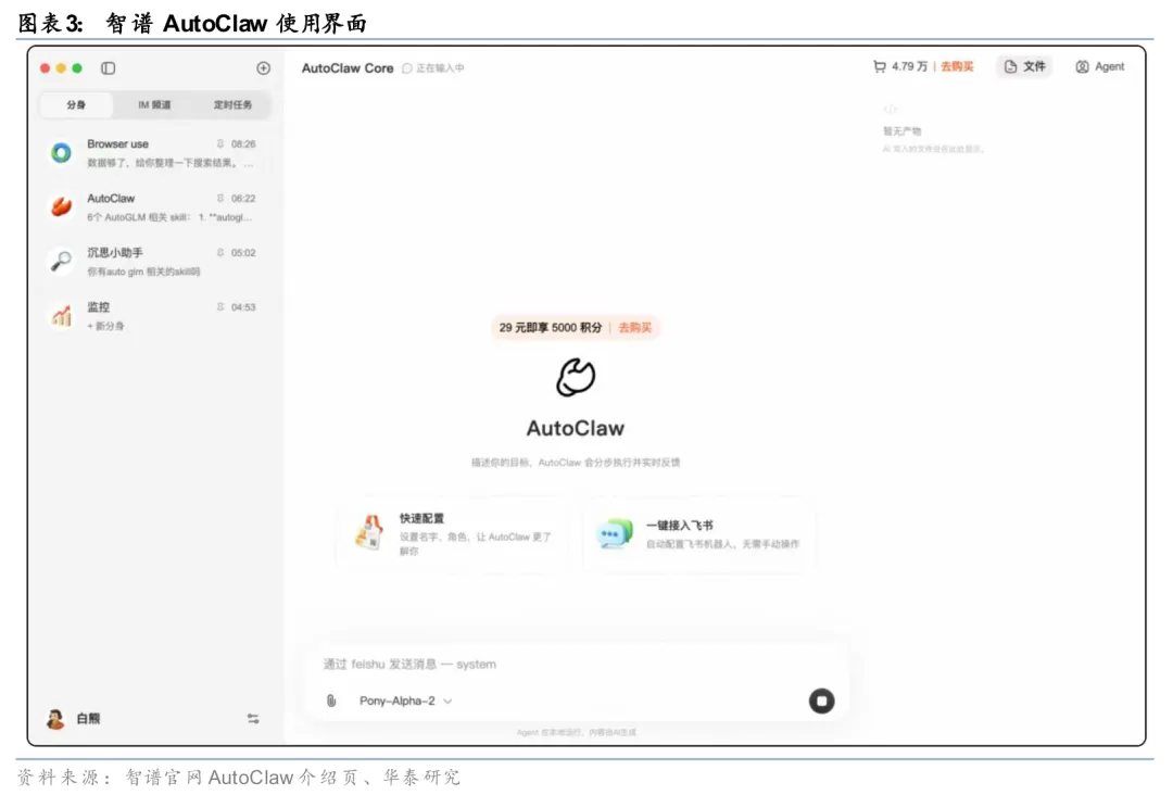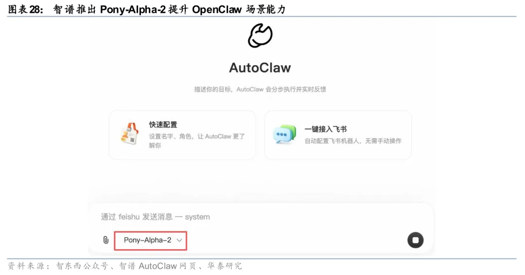 智谱同步将模型能力向AutoClaw产品侧延展,推动基座升级与产品化协同推进。据智谱官网产品介绍,AutoClaw支持macOS和Windows一键安装,并提供免费体验额度,降低了OpenClaw类产品的使用门槛;在模型接入上,AutoClaw开放任意模型的Coding Plan或API接入,推荐DeepSeek、Kimi、MiniMax、GLM等模型,兼顾灵活性与生态兼容性。与此同时,AutoClaw内置了面向OpenClaw场景优化的Pony-Alpha-2模型,其在工具调用稳定性、任务推进效率和持续执行能力上更适合Skill调用、定时任务等真实工作流;产品还集成AutoGLM Browser-Use能力,以补足复杂浏览器任务执行短板,并预置50+Skills,推动Agent从单轮调用走向连续工作流执行。我们认为,智谱本轮更新的意义不只在于基座能力提升,也在于其开始形成“模型升级—工具增强—产品落地”的完整闭环。