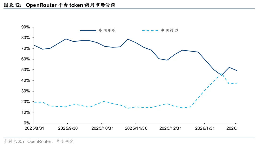 模型层已出现高端模型拼性能、二线模型拼性价比的格局。海外开发者、初创企业切换至中国模型实现Token出海,而目前OpenClaw单次任务Token调用海量,中国模型有望凭借极致性价比优势持续扩大份额,Token出海趋势有望延续,带动国内算力需求Beta持续向上,行业景气度将从核心算力芯片向AIDC、云与算力服务、配套电力设备及服务器等环节全面外溢。