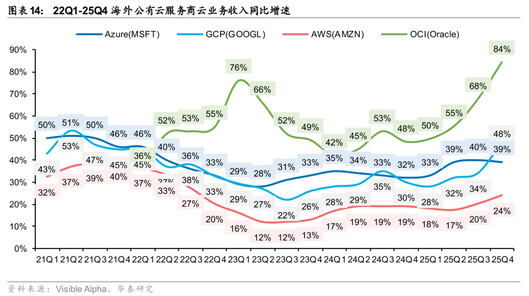 海外科技公司25Q4业绩持续披露,多数公司上修CY26Q1收入指引。25Q4 海外AI应用公司业绩基本超市场预期,CY26Q1收入指引呈小幅上修状态。1)AIInfra:云厂商业绩呈加速兑现趋势,Google、Oracle、Amazon云业务边际显著改善,云业务营收同比增速分别为48%、84%、24%,增速相较于25Q3环比提升14、16、4pct;2)基础软件:SaaS悲观预期下,CDN、数据服务等厂商存在较大错杀概率,主要原因在于到此类厂商多采用消费型计费,存在较低的席位下降风险;3)应用软件:模型厂商Anthropic在26年2月24日产品发布会上表示,“模型厂商与软件厂商是合作而非竞争关系”,介绍了其推出的Claude Cowork AI软件与DocuSign、LegalZoom、Salesforce等应用的数据协同;美股SaaS受模型吞噬的悲观预期略有缓解,核心关注26年应用软件的Agent放量节奏。