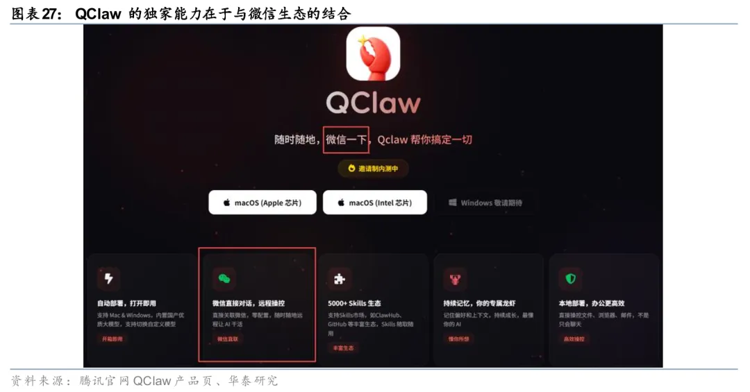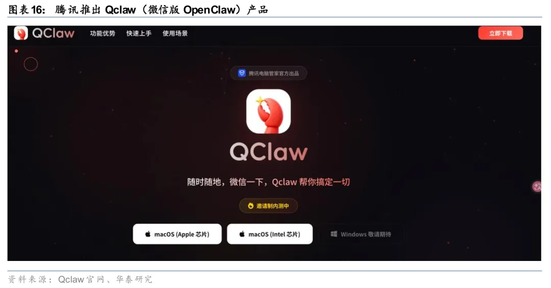 互联网大厂:以平台入口为锚,抢占Agent时代流量分发权。我们注意到,互联网大厂将OpenClaw相关的AI功能与自身应用深度结合,使其成为Claw产品的核心卖点,例如腾讯接入微信和QQ、字节深度绑定飞书、百度接入百度APP。腾讯的QClaw可以通过微信与AI直接对话,使得用户可以通过微信便捷地使用AI,未来有望调用微信内沉淀的大量信息;虽然普通版本的OpenClaw已经可以与飞书集成,但字节的ArkClaw集成了更多飞书办公套件,实现更深度的应用。我们认为,互联网大厂有望通过Claw类产品将AI的入口从模型层聊天框转移到自身应用聊天框,抢占流量入口的同时提升自身应用的AI能力,并通过云服务变现。