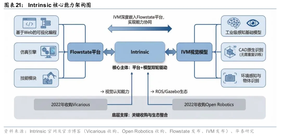 Intrinsic的核心是打造工业机器人的统一软件入口:Flowstate 让开发和部署从工程项目转向模块化工作流,IVM 则让机器人拥有更强的环境理解能力,从而支撑柔性制造。其中,Flowstate解决的是工业机器人“难开发、难部署、强依赖专家”的问题:以Web 化开发环境、可视化编排、仿真引擎、技能模块,将机器人项目从重度定制工程改造成更接近软件配置的流程,目标是把传统需要数周完成的编程压缩到数小时,并让非专业人士也能快速构建自动化工作流。IVM(Intrinsic Vision Model)则解决工业自动化里更难的一层——“看见并理解现场”。IVM作为Intrinsic Intelligence的一部分嵌入 Flowstate,提供环境感知、物体识别、CAD 原生定位等能力,使机器人不再需要针对每个新零件反复采集和训练数据,而能更快切入复杂装配、电子制造等原本依赖人工的工序。