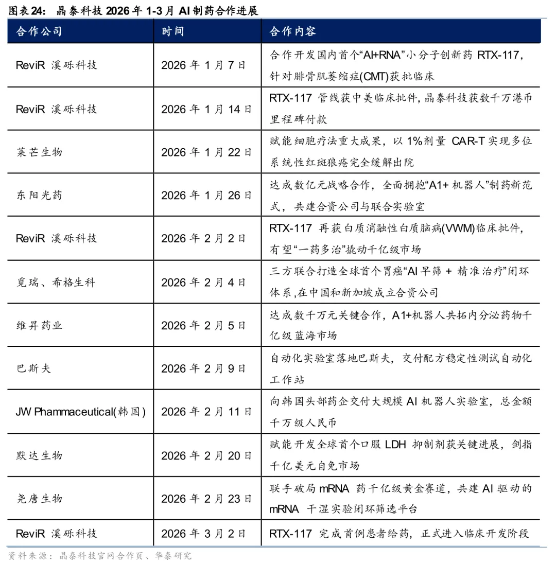 从商业化进展来看,各大型药企合作持续深入,AI制药领域商业化合作持续加速。2026年1月26日,晶泰控股与东阳光药达成数亿元战略合作,共建 AI+机器人联合实验室与非临床药物大模型,实现底层技术与新药管线开发及商业化的全方位合作。同时,晶泰控股孵化企业溪砾科技(ReviR)的创新药管线RTX-117成功实现中美双地IND获批,晶泰收到数千万港币里程碑付款,3月2日,RTX-117完成首例患者给药,正式进入临床开发阶段。