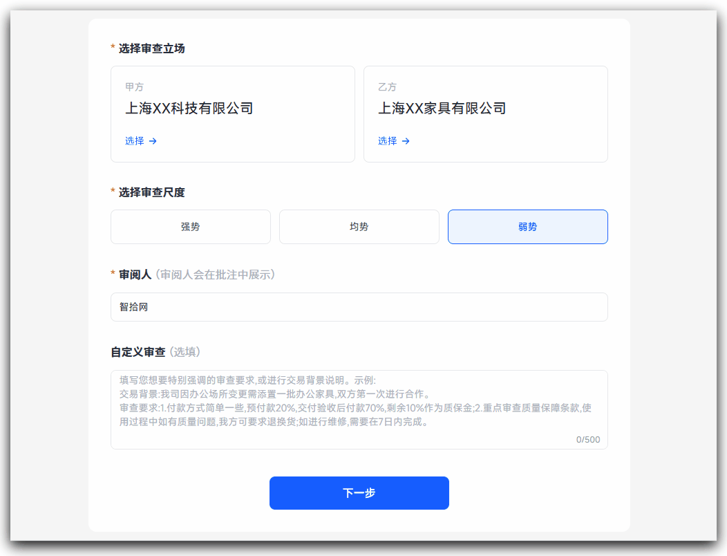 你设定自己是“强势甲方”,它就会死磕付款节点、知识产权归属和违约责任的设定;你设定为“弱势乙方”,它就会替你保住退出权、限制己方责任范围、争取对己方有利的管辖条款。