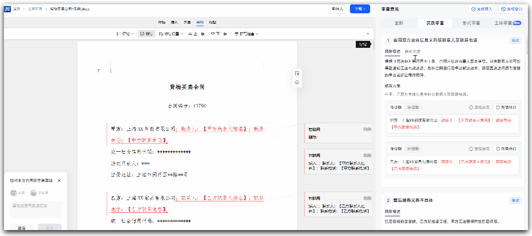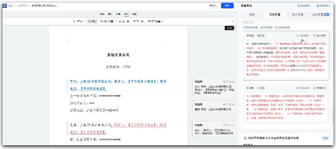 一类是直接改——措辞已经写好,律师一键采纳即可;另一类是需确认——标注成批注,明确提示需要律师介入判断,不越界替你做决策。