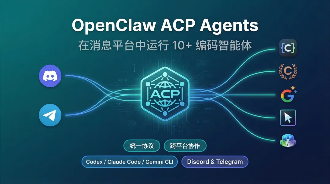 OpenClaw ACP Agents 通过 acpx 插件把 ACP 协议接到了消息平台, 让你能在 Discord、Telegram 中直接驱动 10+ 编码智能体.