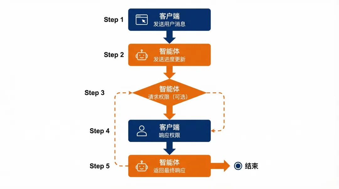 Client → Agent: session/prompt发送用户消息Agent → Client: session/update通知(进度更新)Agent → Client: 文件操作或权限请求(如需要) Client → Agent: 权限批准或拒绝 Agent → Client: session/prompt响应(带 stopReason)