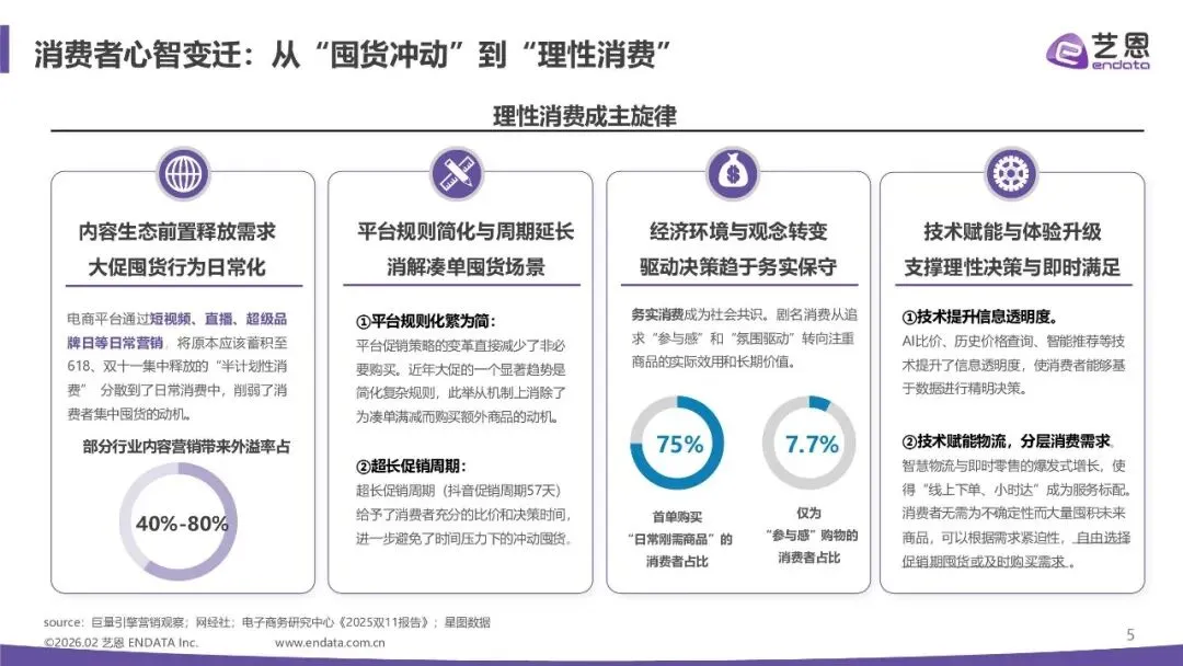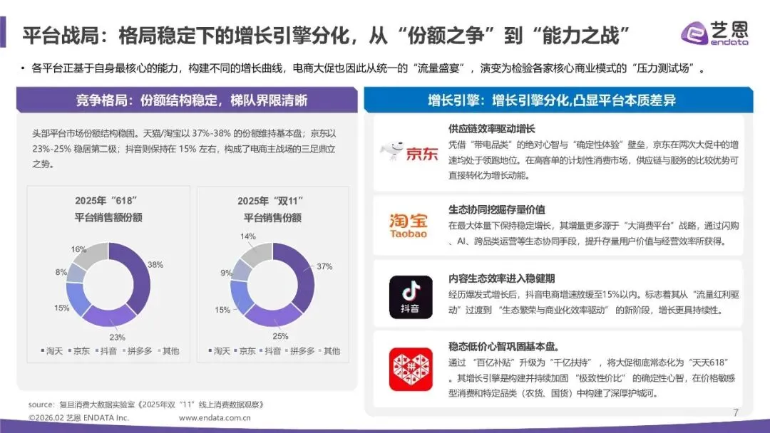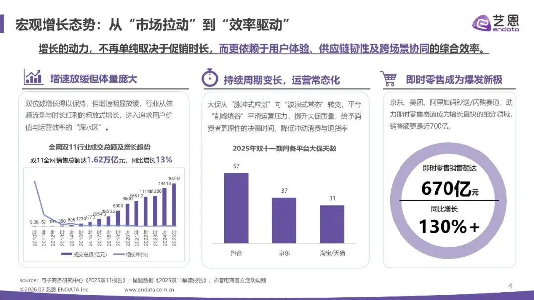 宏观增长态势:从"市场拉动"到"效率驱动"增长的动力,不再单纯取决于促销时长,而更依赖于用户体验、供应链韧性及跨场景协同的综合效率。
