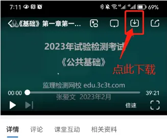 3、打开要下载的某一节视频,点右上角向下箭头,下载。