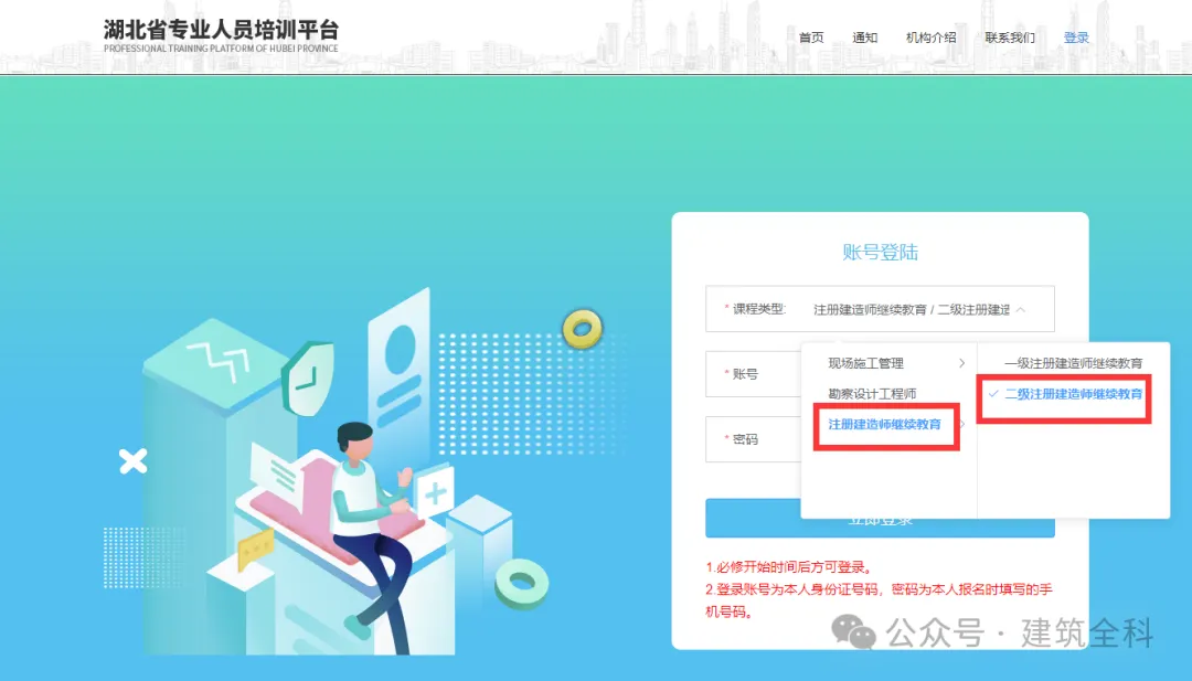 注意:必修课开始时间后方可登录。用户名为:本人身份证号,密码为:本人手机号(二级建造师继续教育申报系统填写的手机号)。忘记填报的手机号的,可以登录湖北省二级建造师继教系统中点击:事项查询(点击本人的名字),看到的基本信息显示的联系电话即为登录培训平台的密码。