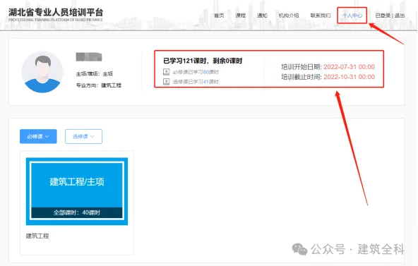 进入个人中心,即可查看当前已学习课时及剩余课时,培训截止时间。
