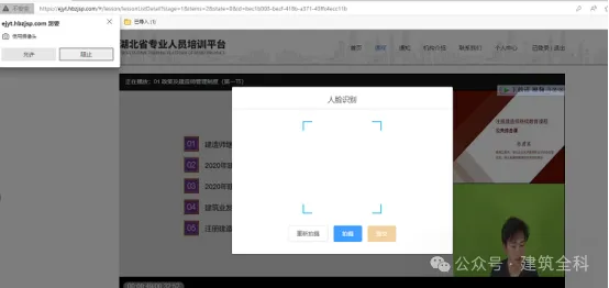 4、每节课学习过程中,系统随机弹出人脸识别,完成人脸认证后才能继续学习,没有完成认证的将无法继续学习,课程暂停,返回课程菜单栏,需要重新进入学习中的课程,学时系统会计算。