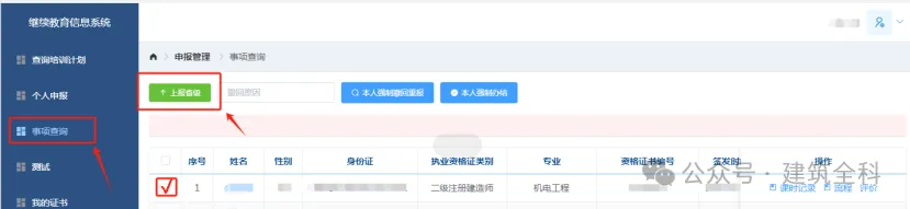 5、所有课程全部完成后,需等待1个工作日,由培训平台审核并推送数据,然后学员登录湖北省二级建造师继教系统,点击左边菜单栏“事项查询”勾选本次继教的事项后,点击“上报省级”,等待主管部门审核通过后进入继教系统下载继续教育合格证书即可。