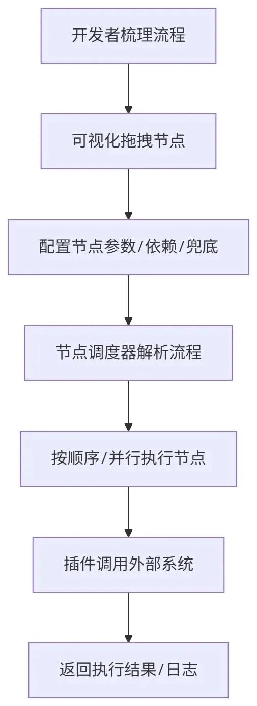 节点调度器:负责解析可视化流程的节点依赖关系,按顺序或并行执行节点,处理节点间的输入输出映射,同时提供超时重试、异常捕获、兜底降级等流程控制能力;