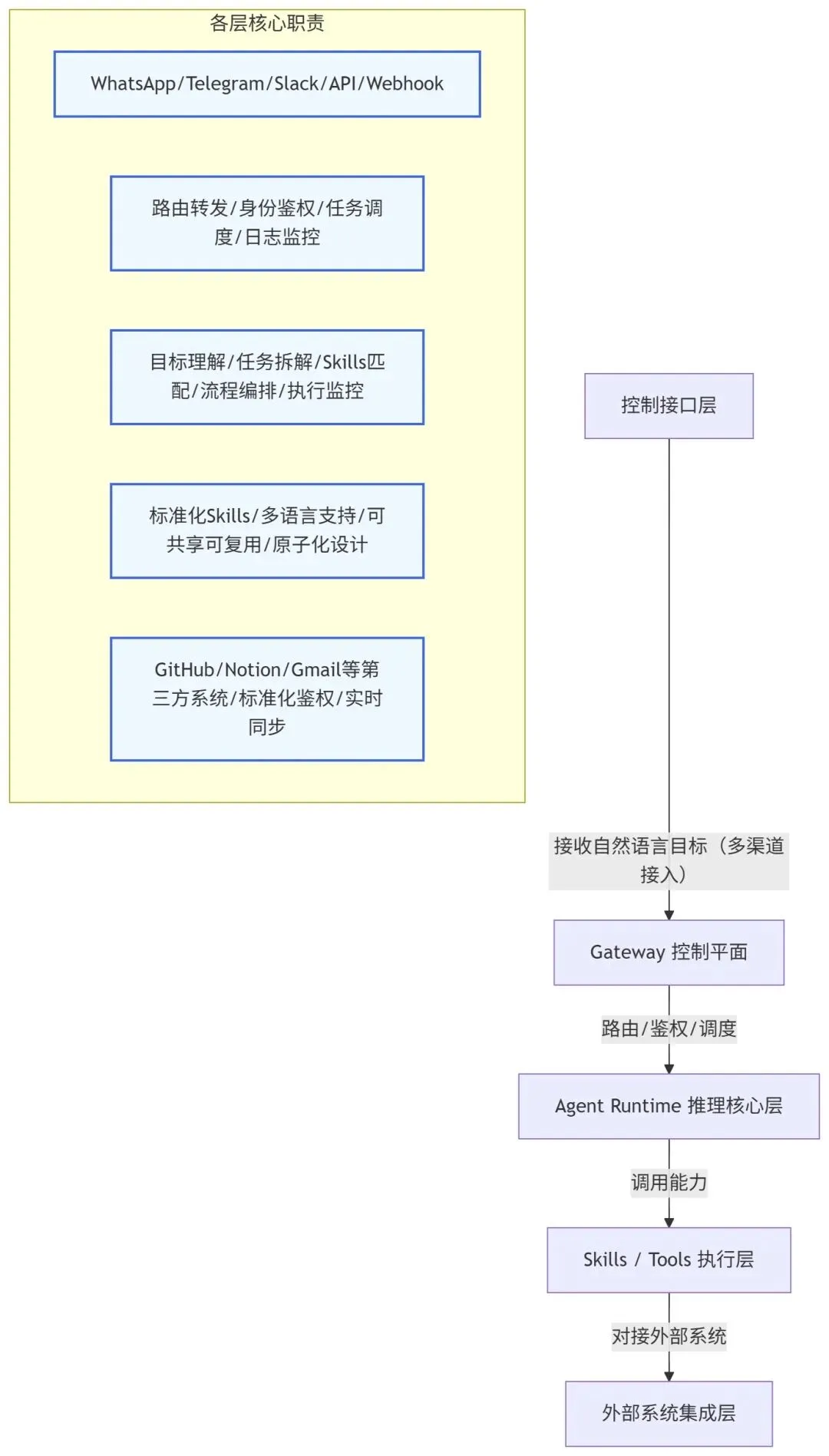 负责与各类第三方系统、服务进行对接,通过 Skills 调用外部系统的 API 或接口,实现多系统联动,是自动化流程能够落地的基础。