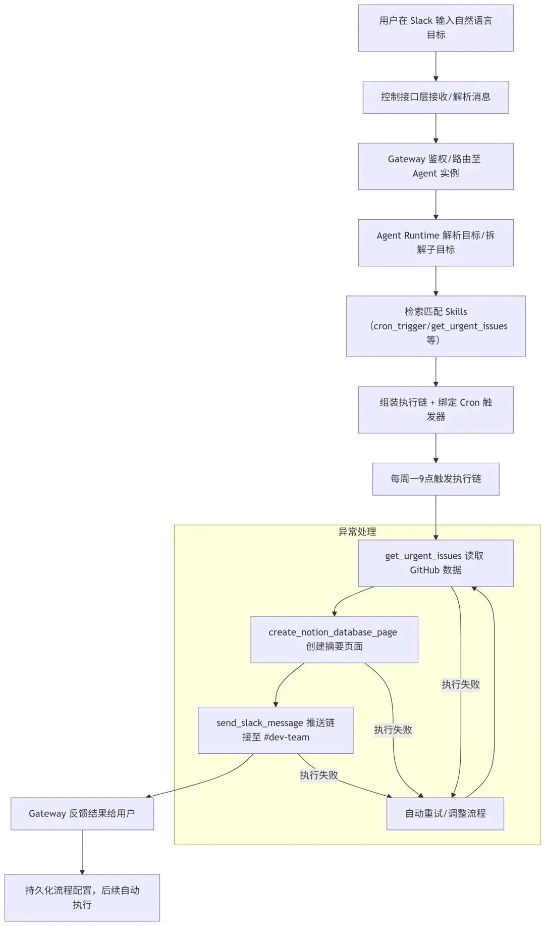 用户在 Slack 中输入自然语言目标:“每周一早上 9 点,扫描 GitHub 仓库(owner/repo: openclaw/docs)中标注了 urgent 标签的 Issue,在 Notion 数据库(数据库 ID: 123456)中创建摘要页面,包含 Issue 标题、链接、创建时间,然后将 Notion 页面链接发送到 Slack 的#dev-team 频道。”