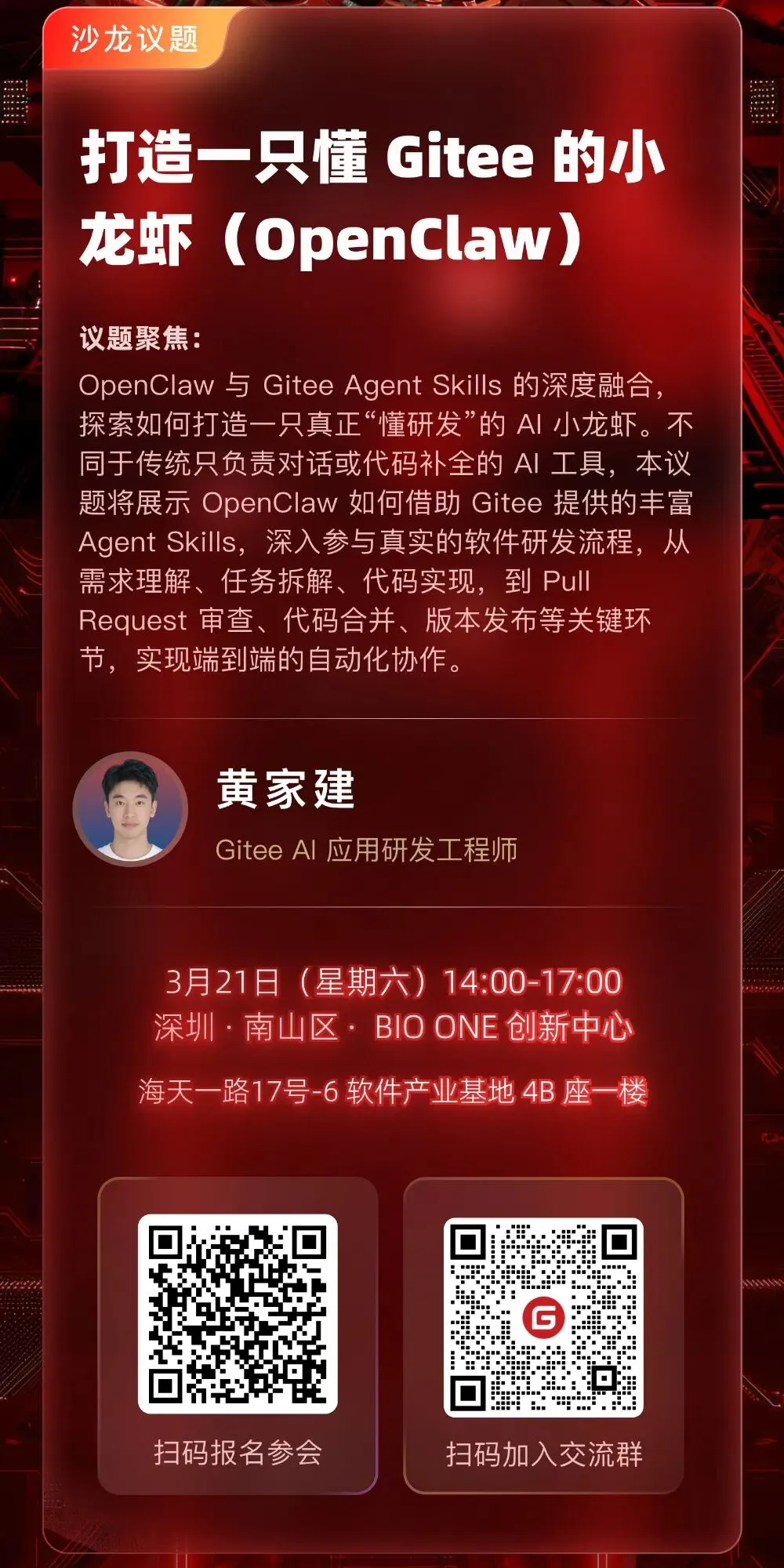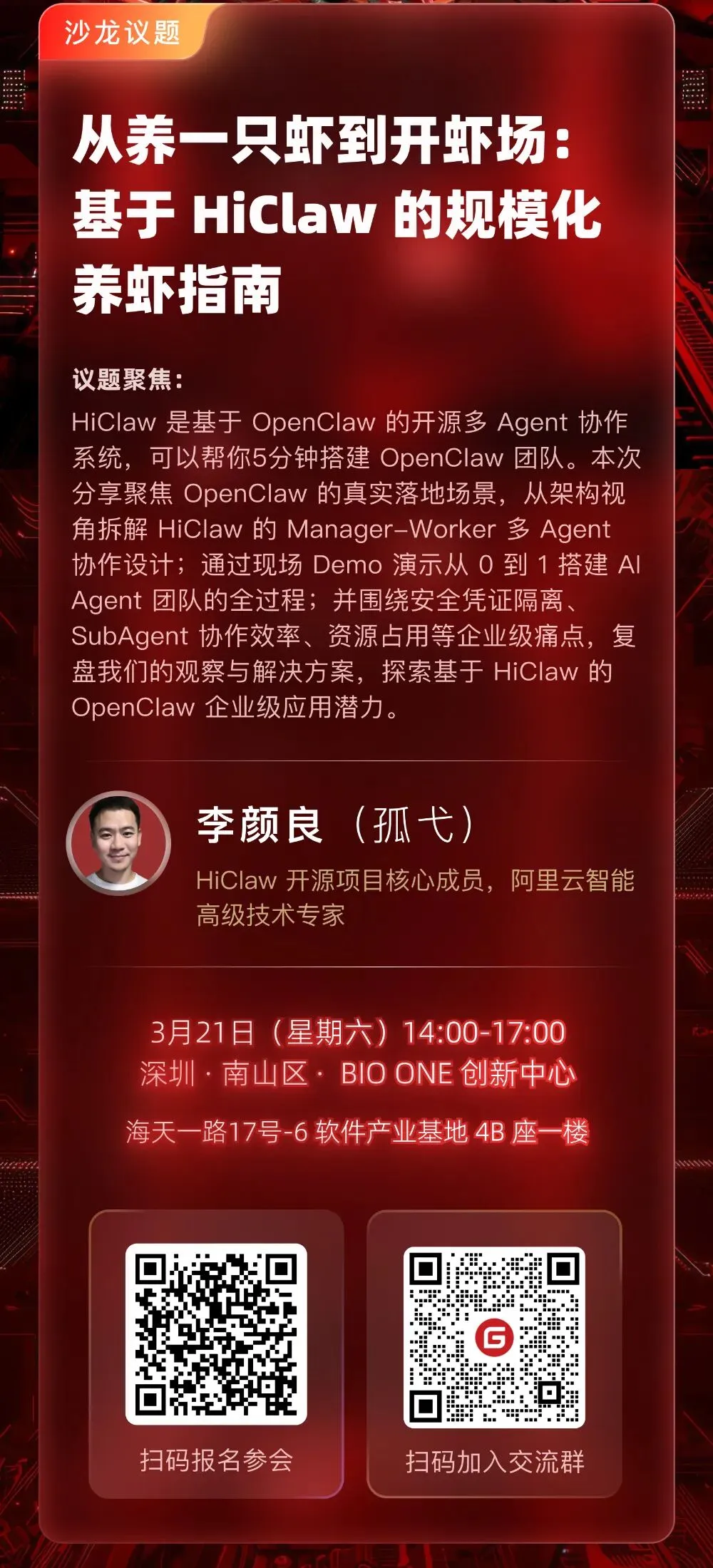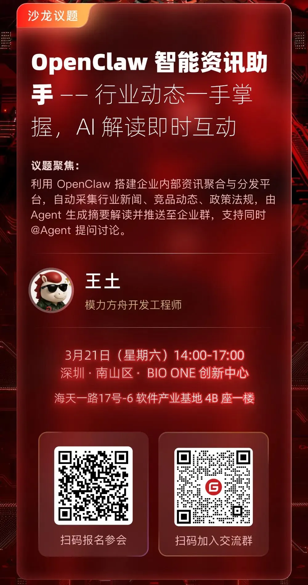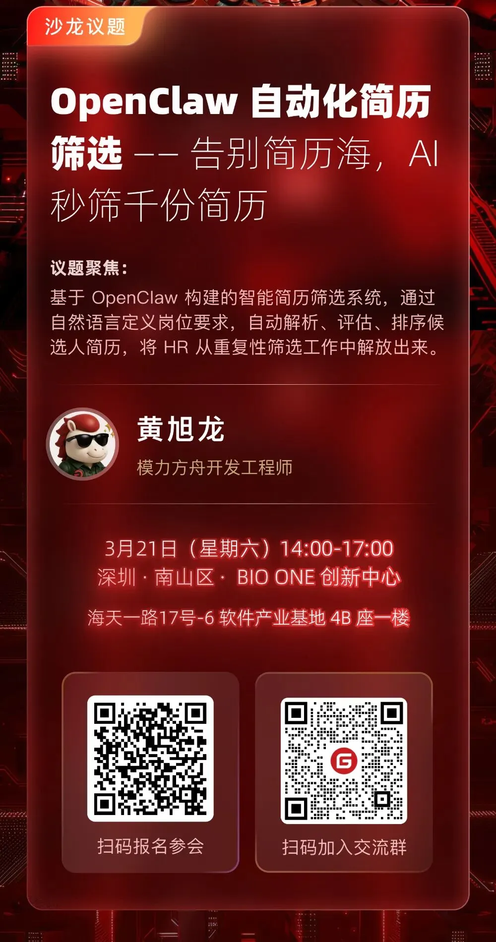 时间:2026 年 3 月 21 日(周六)14:00–17:00(13:30 开始签到) 地点:深圳 BIO ONE 创新中心 - 哈佛厅(南山区海天一路 17 号-6 软件产业基地 4B 座一楼,9 号线深大南站出站步行约 600 米)