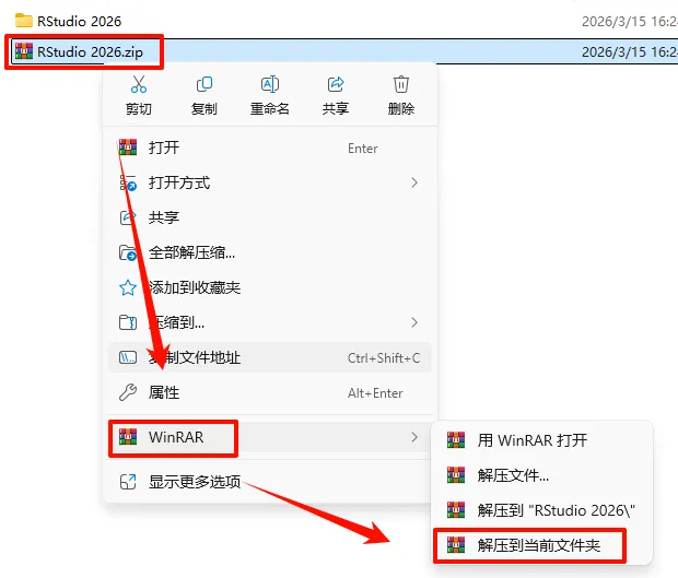 1.选中下载的压缩包,然后鼠标右键选择“解压到当前文件夹”(没有解压选项点这里)
