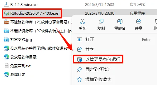 12.返回刚刚解压的“RStudio 2026“文件夹,鼠标右键”RStudio-2026.01.1-403.exe”选择“以管理员身份运行”