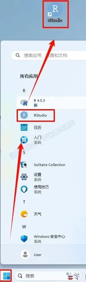 17.点击“开始“菜单栏,点击“所有应用“,找到“RStudio“软件,鼠标左键拖拽到桌面上即可创建桌面快捷方式