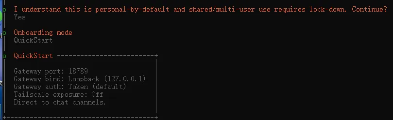 o I understand this is personal-by-default and shared/multi-user use requires lock-down. Continue?| Yes|* Onboarding mode| > QuickStart (Configure details later via openclaw configure.)| Manual—