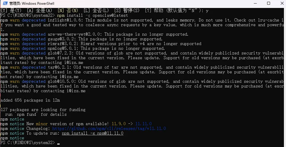 PS C:\WINDOWS\system32> Set-ExecutionPolicy -ExecutionPolicy RemoteSigned -Scope CurrentUser执行策略更改执行策略可帮助你防止执行不信任的脚本。更改执行策略可能会产生安全风险,如 https:/go.microsoft.com/fwlink/?LinkID=135170中的 about_Execution_Policies 帮助主题所述。是否要更改执行策略?[Y] 是(Y) [A] 全是(A) [N] 否(N) [L] 全否(L) [S] 暂停(S) [?] 帮助 (默认值为“N”): APS C:\WINDOWS\system32> npm install -g openclaw@latestnpm warn deprecated inflight@1.0.6: This module is not supported, and leaks memory. Do not use it. Check out lru-cache if you want a good and tested way to coalesce async requests by a key value, which is much more comprehensive and powerful.npm warn deprecated are-we-there-yet@2.0.0: This package is no longer supported.npm warn deprecated gauge@3.0.2: This package is no longer supported.npm warn deprecated rimraf@3.0.2: Rimraf versions prior to v4 are no longer supportednpm warn deprecated npmlog@5.0.1: This package is no longer supported.npm warn deprecated glob@7.2.3: Old versions of glob are not supported, and contain widely publicized security vulnerabilities, which have been fixed in the current version. Please update. Support for old versions may be purchased (at exorbitant rates) by contacting i@izs.menpm warn deprecated tar@6.2.1: Old versions of tar are not supported, and contain widely publicized security vulnerabilities, which have been fixed in the current version. Please update. Support for old versions may be purchased (at exorbitant rates) by contacting i@izs.menpm warn deprecated glob@10.5.0: Old versions of glob are not supported, and contain widely publicized security vulnerabilities, which have been fixed in the current version. Please update. Support for old versions may be purchased (at exorbitant rates) by contacting i@izs.meadded 656 packages in 12m127 packages are looking for funding run `npm fund` for detailsnpm noticenpm notice New minor version of npm available! 11.9.0 -> 11.11.0npm notice Changelog: https://github.com/npm/cli/releases/tag/v11.11.0npm notice To update run: npm install -g npm@11.11.0npm noticePS C:\WINDOWS\system32>