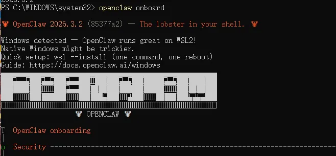 PS C:\WINDOWS\system32> openclaw onboard🦞 OpenClaw 2026.3.2 (85377a2) — The lobster in your shell. 🦞Windows detected — OpenClaw runs great on WSL2!Native Windows might be trickier.Quick setup: wsl --install (one command, one reboot)Guide: https://docs.openclaw.ai/windows▄▄▄▄▄▄▄▄▄▄▄▄▄▄▄▄▄▄▄▄▄▄▄▄▄▄▄▄▄▄▄▄▄▄▄▄▄▄▄▄▄▄▄▄▄▄▄▄▄▄▄▄██░▄▄▄░██░▄▄░██░▄▄▄██░▀██░██░▄▄▀██░████░▄▄▀██░███░████░███░██░▀▀░██░▄▄▄██░█░█░██░█████░████░▀▀░██░█░█░████░▀▀▀░██░█████░▀▀▀██░██▄░██░▀▀▄██░▀▀░█░██░██▄▀▄▀▄██▀▀▀▀▀▀▀▀▀▀▀▀▀▀▀▀▀▀▀▀▀▀▀▀▀▀▀▀▀▀▀▀▀▀▀▀▀▀▀▀▀▀▀▀▀▀▀▀▀▀▀▀🦞 OPENCLAW 🦞T OpenClaw onboarding|o Security ---------------------------------------------------------------------------------+| || Security warning — please read. || || OpenClaw is a hobby project and still in beta. Expect sharp edges. || By default, OpenClaw is a personal agent: one trusted operator boundary. || This bot can read files and run actions if tools are enabled. || A bad prompt can trick it into doing unsafe things. || || OpenClaw is not a hostile multi-tenant boundary by default. || If multiple users can message one tool-enabled agent, they share that delegated tool || authority. || || If you’re not comfortable with security hardening and access control, don’t run || OpenClaw. || Ask someone experienced to help before enabling tools or exposing it to the internet. || || Recommended baseline: || - Pairing/allowlists + mention gating. || - Multi-user/shared inbox: split trust boundaries (separate gateway/credentials, ideally || separate OS users/hosts). || - Sandbox + least-privilege tools. || - Shared inboxes: isolate DM sessions (`session.dmScope: per-channel-peer`) and keep || tool access minimal. || - Keep secrets out of the agent’s reachable filesystem. || - Use the strongest available model for any bot with tools or untrusted inboxes. || || Run regularly: || openclaw security audit --deep || openclaw security audit --fix || || Must read: https://docs.openclaw.ai/gateway/security || |+--------------------------------------------------------------------------------------------+|* I understand this is personal-by-default and shared/multi-user use requires lock-down. Continue?| Yes / > No—