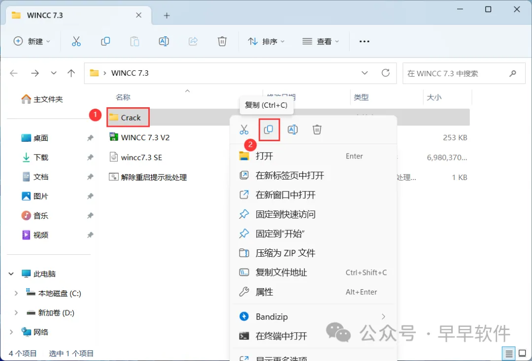 20、回到WINCC 7.3文件夹,找到【Crack】文件夹,再右键点击【复制按钮】