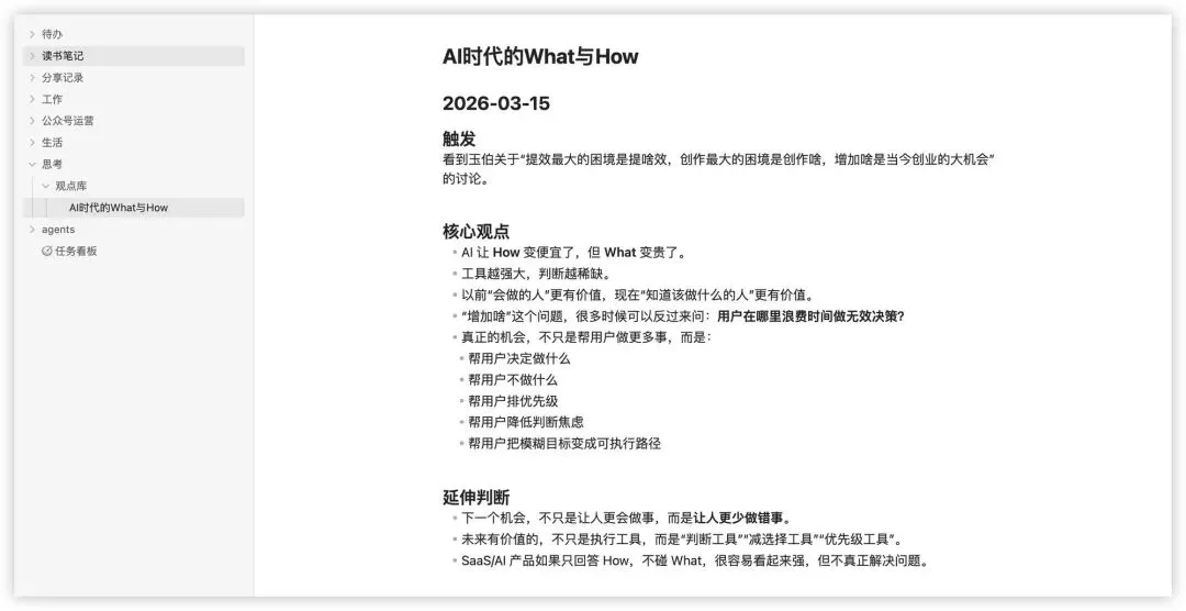 普通聊天工具提高的是当下效率,而这个场景开始让我感受到一种更长期的价值:把记忆从脑子里迁出来,放进系统里,慢慢积累复利。