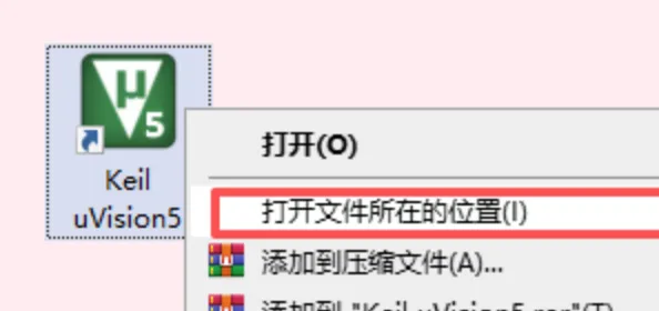 19、选中桌面的Keil uvision5软件图标,右键选择“打开文件所在的位置”
