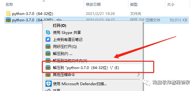 1.选中【Python3.7.0】软件压缩包,鼠标右击“解压到Python3.7.0”