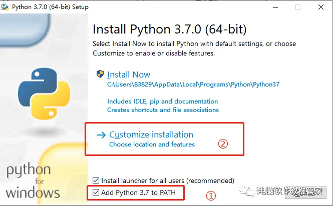 4.先勾选【Add Python 3.7 to PATH】,然后点击【Customize installation】