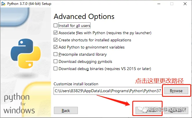 6.点击【Browse】更改软件安装路径:建议安装到除C盘以外的磁盘,可在D盘或其它盘里面新建一个文件夹【python】。然后点击【Install】。